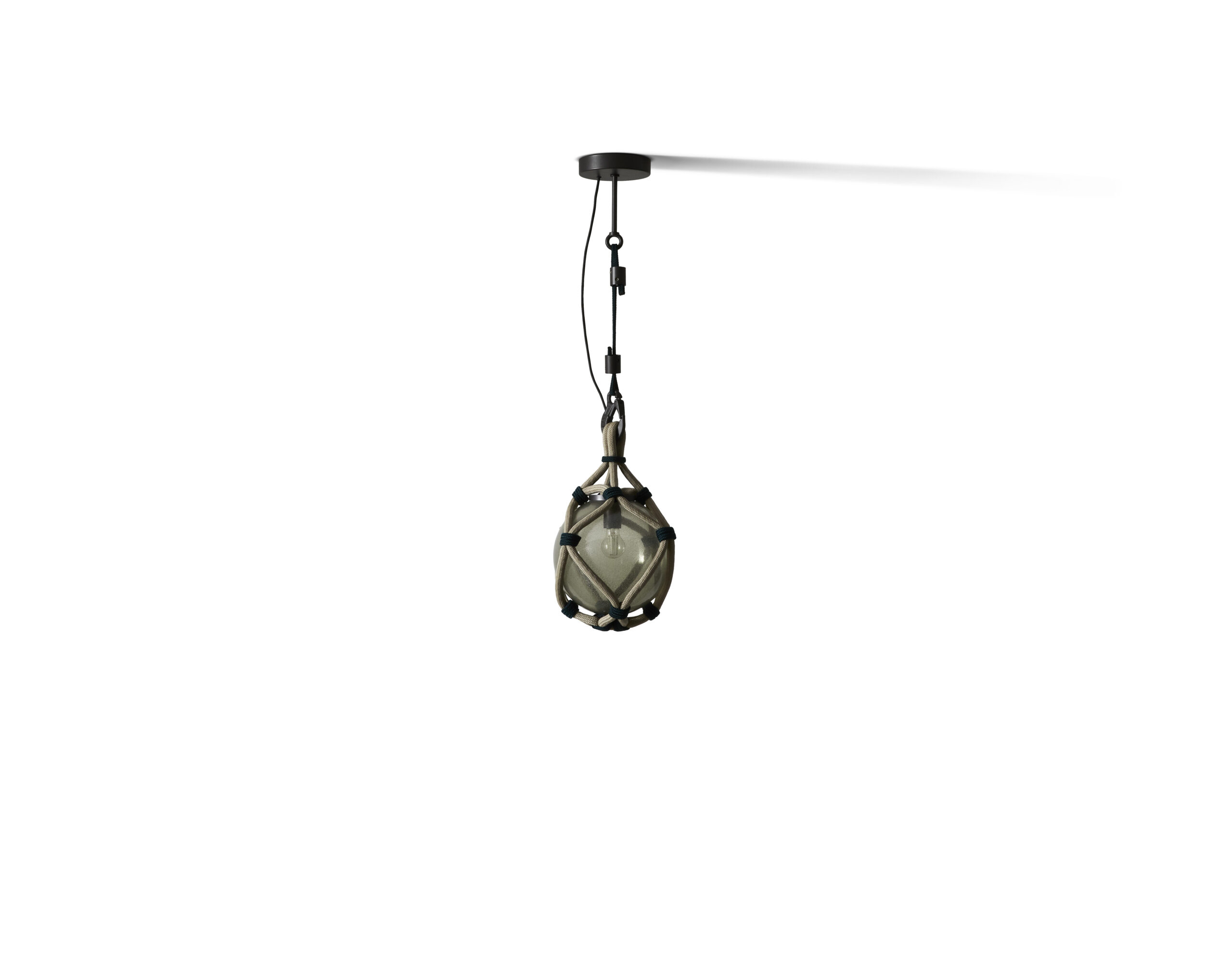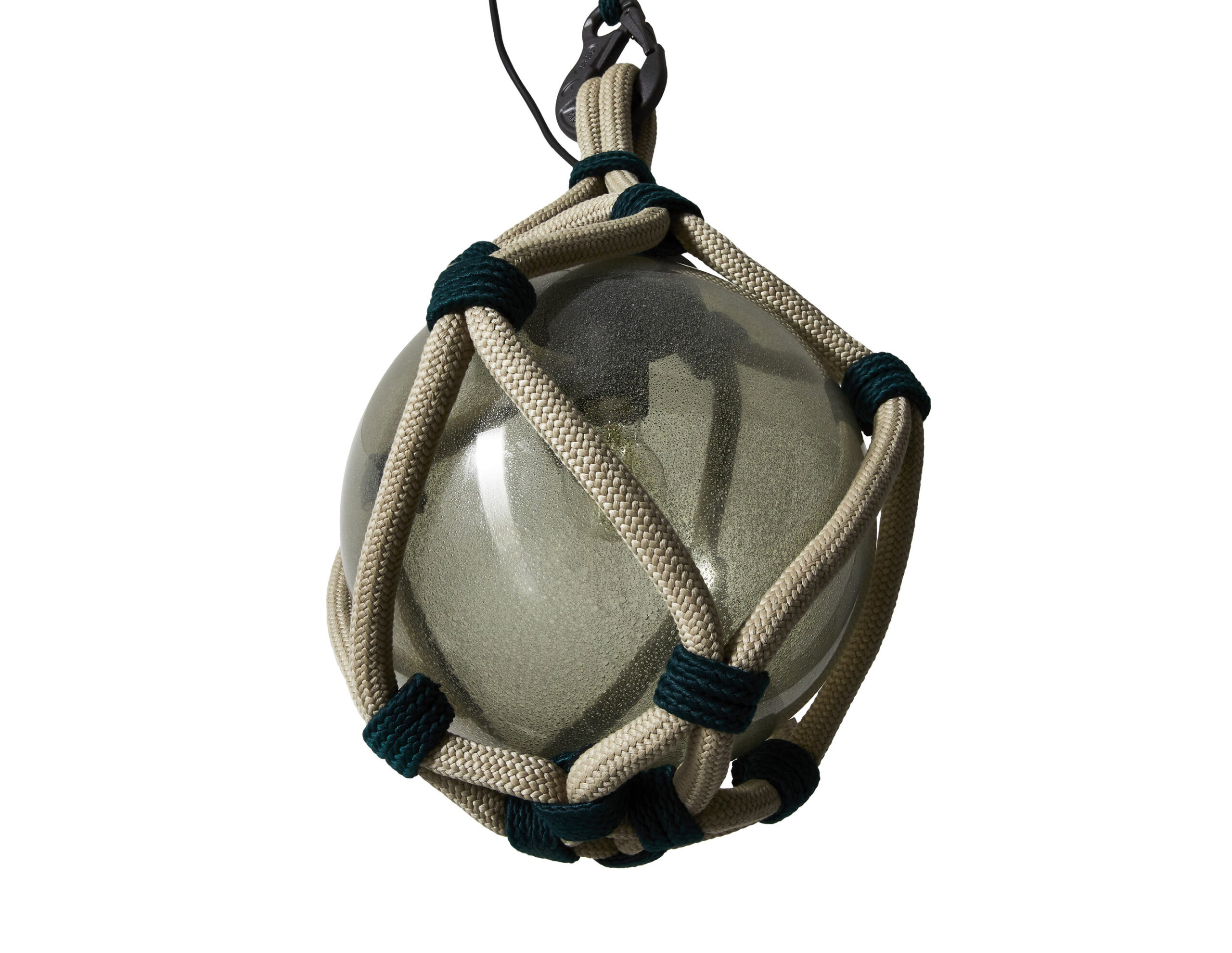 De bol is omhuld met een decoratief knoopnet van touw in contrasterende kleuren, geïnspireerd op de gevlochten details uit de Cassina Outdoor collectie. Deze combinatie van natuurlijke materialen en hoogwaardige afwerking maakt de lamp een stijlvolle en karaktervolle toevoeging aan elke buitenruimte.