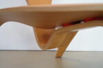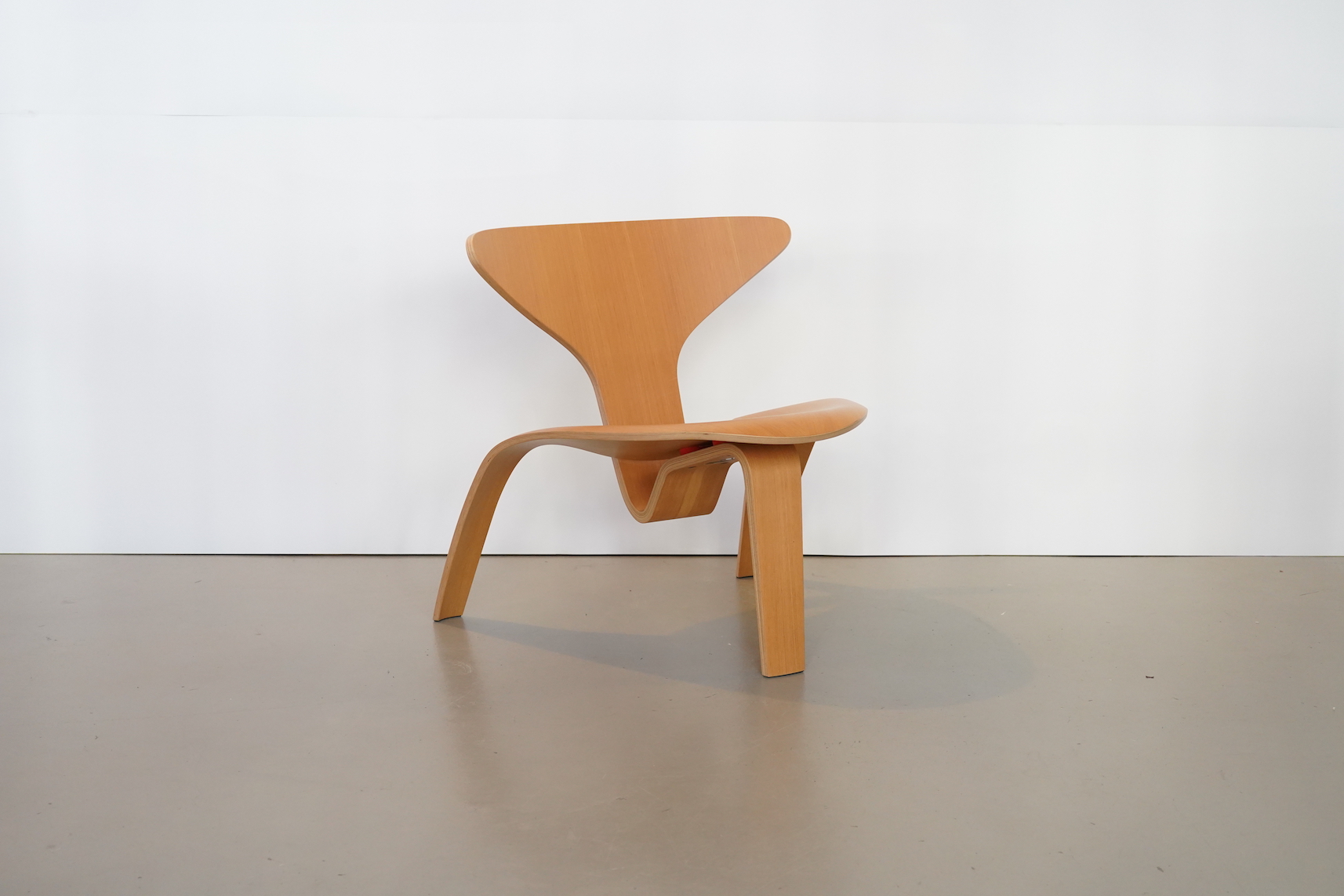 De PK0 A™ is een ontwerp van Poul Kjærholm uit 1952 voor Fritz Hansen. Kjærholm gebruikt sculpturale vormgeving en fuctionaliteit. De vloeiende, gebogen vorm maakt deze stoel tot een kunstobject – uitgevoerd in Oregon pine, met opvallende karmijnrode afstandhouders als subtiel detail.