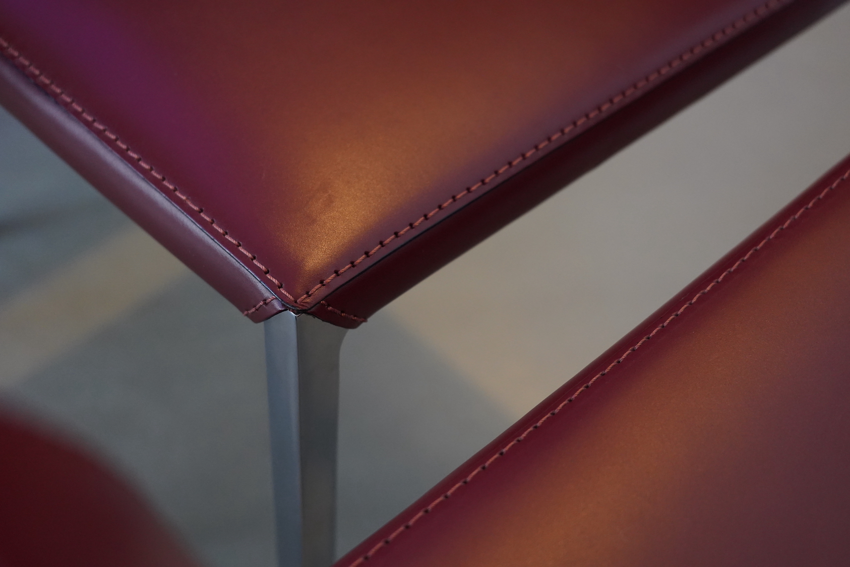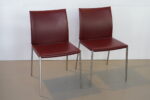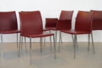 Zanotta “Lia” set van 4 stoelen, ontworpen door Roberto Barbieri in 1998. Deze elegante stoel combineert een strak design met hoog zitcomfort. Het frame is vervaardigd uit duurzaam gepolijst aluminium en de zitting en rugleuning zijn comfortabel bekleed met polyurethaan met vaste bekleding in hoogwaardig tuigleer.